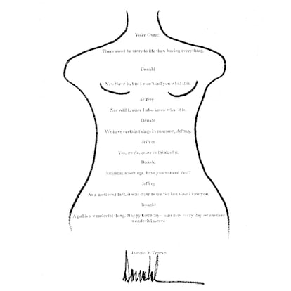 Donald Trump felicitó en 2003 al millonario pederasta Jeffrey Epstein por su 50º cumpleaños con un dibujo del torso desnudo de una mujer y un texto subido de tono, lleno de complicidad y dobles sentidos.