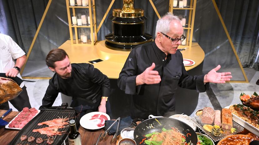 En un más que digno español, el heredero de la saga explica que el menú se diseña durante todos estos meses, y que siempre intentan introducir nuevos platos. Este, por ejemplo, Puck padre está orgulloso de un pad thai con gambas, mermelada de chili, lemongrass, perlas de cebolla roja, menta y cilantro que menea en los fogones, aderezándolo con chorros de champán. Para el hijo, el nuevo plato más especial es el goulash de carrillera acompañado de spätzle —una pasta corta que se suele usar como acompañamiento en platos de carne en Centroeuropa— y que le recuerda a la tierra natal de su padre. También habrá pastas clásicas, como sus agnolotti rellenos de guisantes o sus mac&cheese, los americanísimos macarrones con queso, en este caso con cheddar envejecido. Y por supuesto, su pastel de pollo trufado, un clásico que hacen año tras año y el favorito de Barbra Streisand, confiesan.
