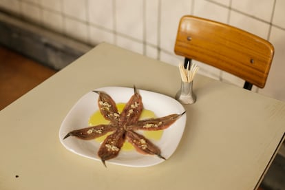 El vermut, con o sin sifón, no descansa. “Seguimos trabajando con la misma bodega de Reus con la que empezaron mis padres en la Avenida Madrid. Hace poco nos llamaron por ser sus clientes más longevos y fuimos a hacerles una visita”, recuerda. Lo acompañan las grandes protagonistas, las salmueras, a las que Ana dedica más de seis horas a la semana para limpiarlas una a una. Un manjar carnoso, dulce y salado, servido con un poco de ajo y vinagre. Las mejores de la ciudad. “He sido muy celosa de la calidad del producto. Si tienes una materia prima muy buena es difícil que no se venda. Aquí lavamos y cocemos los callos, limpiamos las anchoas en salmuera una a una. Hay gente que viene solo a comerla. Si trajera de la otra (quinta gama ya limpia), entonces no vendrían, porque la otra está en cualquier sitio.” También salen croquetas de cocido, boquerones —también caseros—, patatas bravas, morro frito…