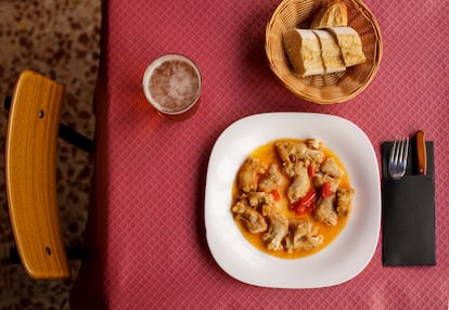 Hoy, las cosas no han cambiado tanto. Ahora entre semana tienen un menú del día por 14 euros. Platos sencillos que desearías que fuesen tu comida diaria: judía verde con patata, coliflor, menestra, macarrones con tomate y chorizo, sopa de pescado, caldo de cocido con fideos y garbanzos o fritada con huevo, suelen ser las opciones de primero. De segundo puede haber salchichas con tomate, albóndigas, lomo, pescadilla rebozada, pollo chilindrón, pechugas empanadas, pollo asado. El postre está incluido —flan, tarta de manzana o de queso—, agua, vino y gaseosa. Sin embargo, mucha gente va de propio a por sus platos de casquería. Lechecillas, manitas de ternasco, callos de ternera, madejas… y las famosas cabezas de cordero (media por siete euros y una entera por 14). Blasco cuenta que, hace 40 años, llegaban a gastar 80 cabezas de cordero a la semana. Hoy, siempre bajo encargo, preparan alrededor de diez, siendo uno de los únicos lugares de la ciudad donde se puede comer este clásico.