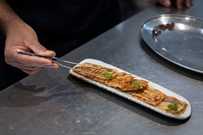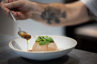 Con el mismo fin de contener precios que subyace en el suquet, las empanadas ya no son de espardenyes (pepino de mar) sino de cigalas con setas (24 euros), y el plato de cebolla (19 euros) es de aprovechamiento total. Esta planta de la familia las liliáceas, después de ser pelada y envasada al vacío con mantequilla ahumada, se cuece a baja temperatura para lograr que quede como un puré por dentro pero con la cubierta dura. De esta manera se emplata entera y condimentada con dos elaboraciones que salen de este puré interior. El primero es el relleno, que se realiza con la misma cebolla, remolacha y botifarra del Perol; y el segundo es un consomé del mismo bulbo aromatizado con romero. “Es cocina de aprovechamiento, incluso las pieles se introducen en el caldo”, apunta Jeffrey Ruiz.