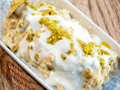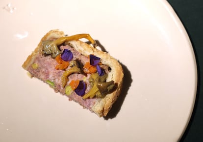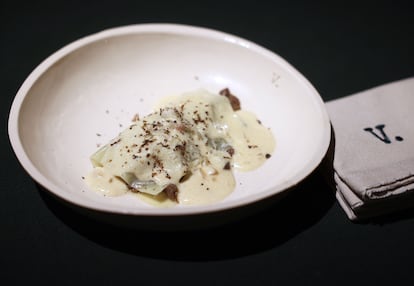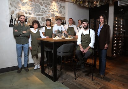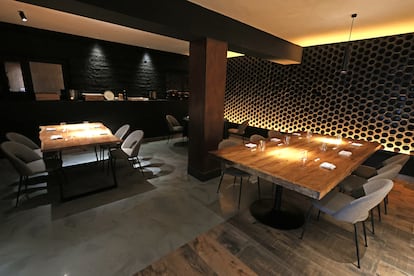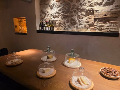 “El cuerpo me pedía más”, asegura. Hace un año empezó a rondarle la idea de instalarse en Ávila, precisamente en el lugar en el que ha acabado. Para ello, se ha aliado con Rodrigo Acebes, empresario vinculado a la hostelería y propietario del edificio. El restaurante es cálido y acogedor, repartido en dos alturas, con luces que enfocan directamente a las ocho mesas, donde pueden sentarse una treintena de comensales. Nada más traspasar el umbral, una amplia mesa de madera exhibe un cuenco con castañas y una selección de cinco quesos cubiertos con cúpulas de cristal. La cocina, abierta a la sala, es el alma del espacio: el cliente puede observar cómo se pelan unas pencas de acelga. “Aquí no se abren botes ni hay cuartas ni quintas gamas”, enfatiza el cocinero. Es el mensaje que desea transmitir: “Las alcachofas se comen ahora, no en verano. Respetamos la temporalidad de los productos”.