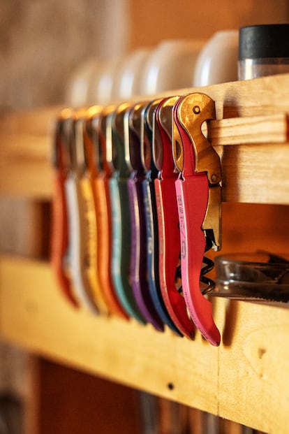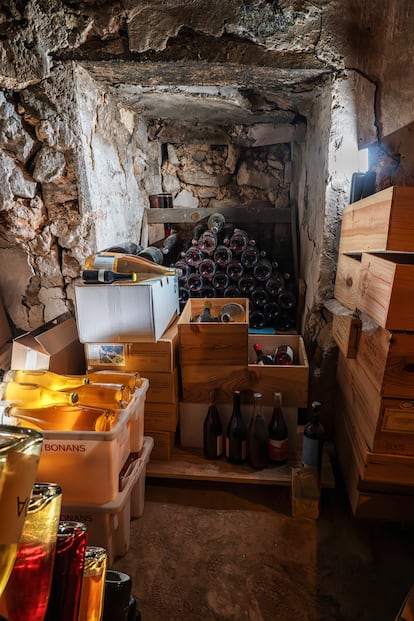 Esta es tierra de blancos y espumosos, elaborados con uvas que han crecido en suelos calcáreos, “que dan esta conducción muy salina, eléctrica y buena acidez al vino”, detalla. Rodeada de 150 hectáreas de bosque, la finca cuenta con 16 hectáreas de viñedo, de las cuáles cultivan 10 de variedad parellada, macabeo, chardonnay y tempranillo. Algunas uvas todavía se compran fuera, pero el objetivo es cosecharla toda aquí. Uno de sus vinos más emblemáticos es La Maca Beu (21,70 euros), que elabora desde 2015. Su nombre es un juego de palabras donde se puede leer macabeo en catalán, macabeu, (90%) y una ingeniosa etiqueta con una mosca y un teléfono para referirse al moscatel (10%), que permiten aportar más datos del vino sin caer en irregularidades. Como cuenta el documental La Contra Etiqueta (2023), de Clara Isamat, productores y elaboradores que no forman parte de ninguna denominación de origen ni se acogen a certificados o sellos, no pueden poner algunos datos básicos en sus botellas, como las variedades de uva que contienen ni el municipio donde elaboran si este pertenece a una DO como la del Penedès.