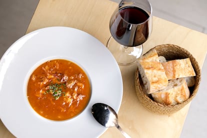 El vermut es uno de los momentos fuertes. Con una carta pensada para compartir, las mesas se llenan de clásicos del aperitivo. Ensaladilla en dos versiones: una con merluza, aceituna negra, langostinos y puerros, y otra de encurtidos y ventresca de bonito; croquetas de jamón, huevos rotos con longaniza o gambas al ajillo, bravas, torreznos con chimichurri u oreja frita con salsa piri piri. Todo con un punto personal y, sobre todo, hecho al momento. Tienen una sección de bocadillos que no tienen fallo. Un pepito de ternera perfecto, un brioche de chipirones o un bikini de paleta ibérica asada y queso. A medio día entran platos algo más contundentes, sus guisos de callos o rabo de toro, son de los que piden pan a gritos. Canelones gratinados, arroces según disponibilidad y alguna sugerencia del día. Esta semana están sirviendo suquet de raya, un guiso de pochas viudas, cazón adobado o morro bravo. “Yo es que las tonterías de las gyozas o baos que son de quinta gama, ir a un sitio que te hagan gastarte X pasta y te estén dando algo que es meterlo al microondas… Me parece que no tiene ningún sentido”, cuenta Alcolea hablando de la carta. “Aquí hacemos todo nosotros, era algo que teníamos claro desde el principio.”