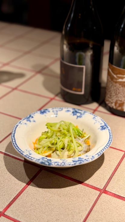 Y ahora, en temporada, en Glug puede comerse una ensalada de puntarelle, una verdura típica de Roma. “Las achicorias, de donde provienen los puntarelle, también se están cultivando en Cataluña. Se aprovecha su bulbo, que hay que cortar muy fino y se debe poner en agua, hielo y limón para que rice. Mi madre, que es romana, sigue la receta tradicional y los aliña con anchoa, limón, sal y aceite. En el restaurante los preparamos en ensalada con una salsa de nduja y una ostra de calibre 00, que da una salinidad y una textura mantecosa que van muy bien con el amargor de los puntarelle”.