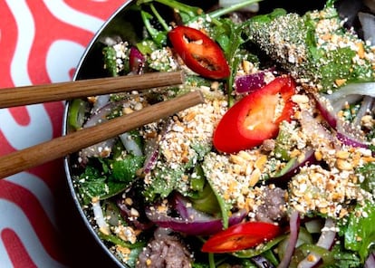 Ensalada de ternera de Yeca Strit Fud (Madrid). En esta ensalada de raíz tailandesa la ternera aporta, mayormente, textura. Las verdaderas estrellas son las aromáticas y otros condimentos como el jengibre, albahaca thai, hierba limón, cilantro, ajo, cebolla y chile, los cacahuetes, la salsa de pescado y la salsa de soja, el vinagre de arroz y el zumo de lima. Dirección: Alonso del Barco, 4, Madrid.