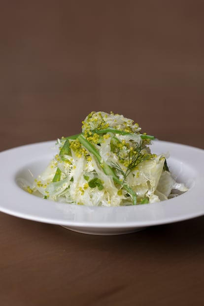 La idea de ensalada perfecta hoy dista mucho de introducir verduras en gelatina. Así lo cuentan algunos cocineros que practican el noble arte de ensamblar vegetales con gracia. Giacomo Hassan, de Bodega Bonay (Gran Via de les Corts Catalanes, 700, Barcelona), prepara una ensalada de apionabo donde la clave está en la cocción de la raíz. “Queríamos introducir un plato de verdura invernal y partimos de la idea de la clásica ensalada de rúcula y parmesano. En este caso, escogimos la raíz de apionabo y fuimos probando distintos puntos de cocción. Intercambiamos el parmesano por un queso de oveja, la rúcula por eneldo y aliñamos con limón, aceite de oliva y alcaparras”.