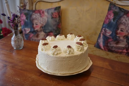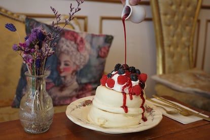 Entre semana, el salón es un lugar tranquilo donde encontrar un servicio de cocina flexible y un espacio para pasar las horas, al margen del ajetreo urbano. Los clientes son ya habituales y los influencers que vinieron por la foto hace unos años se han convertido en amigos. Los fines de semana son otra cosa: es raro no tener que hacer cola para encontrar una mesa. “Ahora lo gestiono mucho mejor, pero después del Covid fue un estrés. Durante el confinamiento hacía vídeos de mis pasteles que se hicieron virales y al reabrir tenía gente haciendo cola todos los días, hasta cuatro horas los fines de semana. Era mucho estrés porque mi concepto es bonito y nos esforzamos mucho para que todo esté muy bueno, pero no merece cuatro horas de cola”, dice Álvarez, que aún se sorprende del inesperado éxito de su salón de té. “Aquellas colas me daban muchos disgustos. Luego me dejaban malos comentarios diciendo que no merecía cuatro horas de cola. Lo siento, nada merece cuatro horas de cola para sentarse a comer”, defiende.