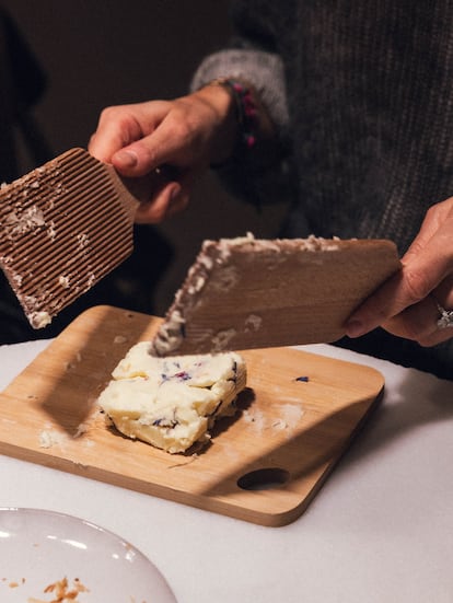 “Las familias quieren enseñar a sus hijos lo que hacían sus abuelas”, explica María de La Jarradilla. Para ella, la mantequilla tiene un halo nostálgico y entrañable que alude a la comunidad y a la familia. “La preparaban las personas que no estaban en edad de trabajar: niños y ancianos. Transporta a la infancia: yo no la hacía con mi madre, sino con mi abuela”, rememora. Las clases son una oportunidad de cazar al vuelo ese instante mágico de aprendizaje. “La batimos entre todos: yo suelo hacer dos grupos, así tiene la gracia de la competición”, ríe. El resultado tiene espíritu compartido: se bate, se saca y se amasa con cuchara. El bocado final es obra de muchas manos.