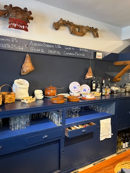 Con un pie dentro de la taberna, la sensación es de refugio: marrones rústicos, azules barco, blancos alubia, mimbre, barro, cristal. En el suelo, terrazo que alterna baldosas negras y blancas como un tablero de ajedrez. A la izquierda, una barra larga se extiende hasta la cocina y ofrece un primer contacto costumbrista pintado a tiza —caldo, croqueta, gilda, callos, mejillón tigre, bonito, anchoa, queso y camarón frito— que se mueven entre los dos y los 11 euros, para quien decide ir a tomar el aperitivo o para quien llega unos minutos antes a su reserva y le pierde el ansia. Sin un espacio como este, imposible ser taberna; tampoco sin sus cuatro habituales y sus Voll-Damm. Durante aquel mes previo a la apertura se dedicaron a hacer una limpieza a fondo —bufandas del Athletic, calabazas secas y “flora y fauna propia”—, aplicaron unas capas de pintura y apenas tocaron nada más.