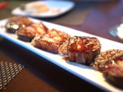 Fue muy resultona la versión de la empanada gallega como bocadillo de merluza entre masa de gyoza frita. Espectacular el plato de tomates, sobre todo el tomate en rama marinado en soja y cocido al horno, una forma de tratar esta solanácea que concentra el sabor dulce y el umami. Muy bueno el rabo de vaca vieja con 120 días de curación, que se deshacía y sabía a la madre de todas las carnes.