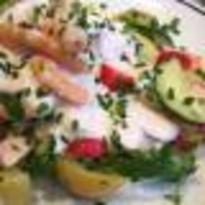 Encurtidos caseros exprés, langostinos bien aprovechados y una falsa salsa rosa acompañan a las patatas de esta ensalada con aires del Este.