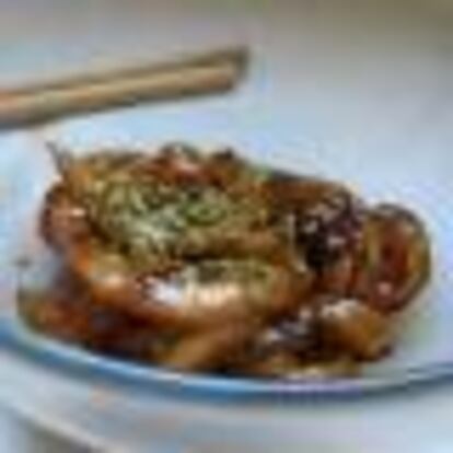 Lacamos unos contramuslos jugosos con miel, salsa de chile y soja, con la piel bien crujiente y refrescamos el conjunto con una salsa tailandesa.