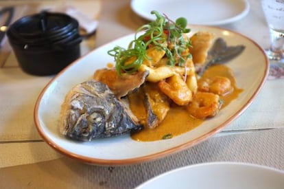 Ni ahá, ni uhú. Y no fue tan sencilla la dorada a lo macho. El pescado se cocina al horno y se acompaña de unas salsa dulzona, muy agradable, a base de ajíes y marisco –pulpo, langostinos, sepia–.