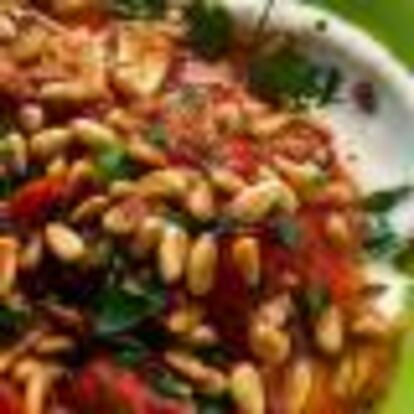 UNTABLE DE YOGUR, TOMATES CHERRY CONFITADOS Y PIÑONES