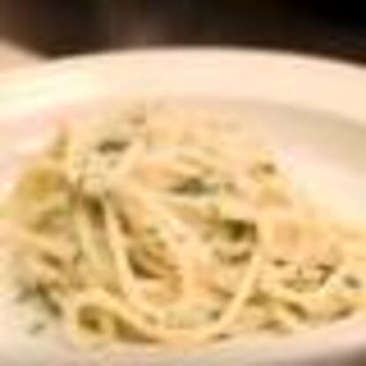 Un clásico italiano versionado: el ajo va blanqueado y emulsionado con agua para obtener una crema suave. Estos espaguetis te harán decir mamma mia!
