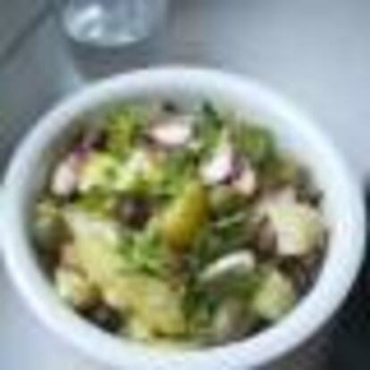 Esta ensalada es sorprendentemente fresca y ligera, alegre al paladar y a pesar de ser bastante patatera no empapuza lo más mínimo.