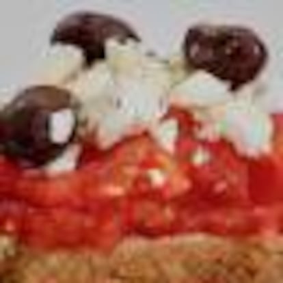 El tomate es el rey de esta receta y lo acompañan una buena rebanada de pan de cebada tostado, unas aceitunas negras y queso feta. Es la versión griega de la bruschetta y del pa amb tomàquet.