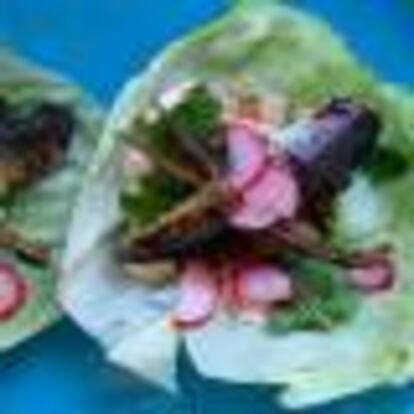 Una papada melosa y una sardina con potente sabor a mar, envueltas en una hoja de lechuga y con la raspa crujiente como acompañamiento.