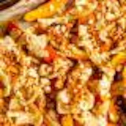 Una versión sencilla de una receta del maestro Yotam Ottolenghi que combina calabaza, cebolla, frutos secos y una salsa fetén.
