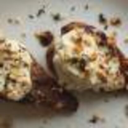 Fruta asada y caramelizada sin azúcar añadido, un chocolate potente y una crema con un toque suave de queso azul: un jetapostre de escándalo.