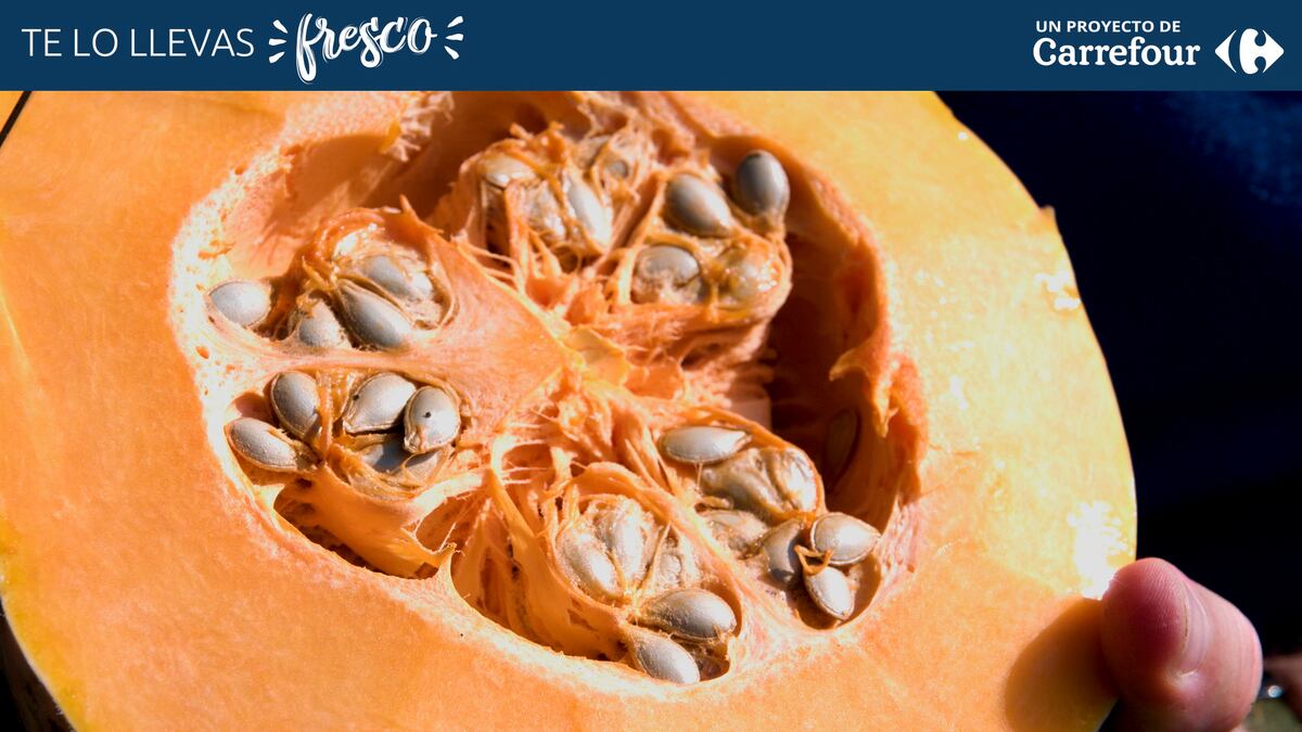 De otoño a invierno la calabaza reina entre las hortalizas: su sabor es suave y dulce, se conserva fácilmente y acepta muchos métodos de cocción. Aparte de estas bondades, esta cucurbitácea naranja esconde mucha más información. Por ello nos hemos trasladado hasta Verdcamp Fruits para que Ernest Mas, proveedor de Carrefour, nos cuente en este vídeo sobre su cultivo y consumo, sobre sus diferentes variedades y, lo más importante, cómo reconocer cuándo está en su punto óptimo (tanto por dentro como por fuera). Y a todo esto le hemos sumado una receta que demuestra que la calabaza se puede comer cruda.