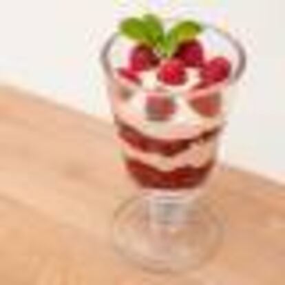 Si sabes remover, sabes hacer este postre: así de fácil es. Además puedes cambiar las frambuesas por otros frutos rojos, mango, papaya o incluso plátano.