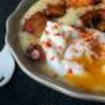 La yema de huevo líquida desparramada en el plato. No hay salsa más sencilla y deliciosa que pueda acompañar a esta crema de patata con pulpo cocido.