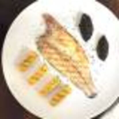 La polenta, un preparado hervido de maíz con mantequilla, acompaña como guarnición a unos lomos de lubina hechos a la plancha en esta receta.