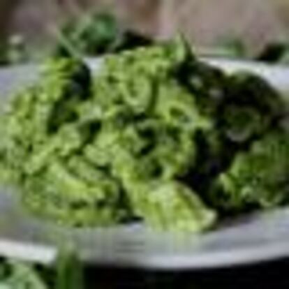 El pesto es una salsa muy conocida para condimentar las pastas. Aquí se elabora con espinacas crudas, aceitunas verdes, ajo, almendras y aceite de oliva.