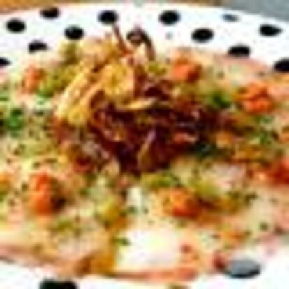 La increíble melosidad del marisco crudo compensa el trabajo de aplanarlo entre dos hojas de papel de horno. Unas chips de alcachofa crujientes y un toque de romesco rematan la jugada.