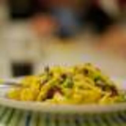 Adaptamos la carbonara de toda la vida sustituyendo la panceta por cecina, y añadiendo un poquito de verde de temporada en forma de guisantes.