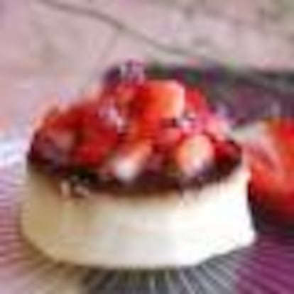 El flan es un postre totalmente versátil, en el que podemos sustituir la leche por otros ingredientes como el yogur. Lo acompañamos con un par de frutas de temporada: fresas y frambuesas.