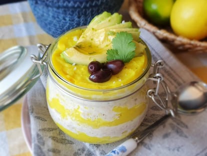 El tema del aceite es uno de esos olvidos que me empujan a beberme de trago cinco litros de valeriana. Raquel admite el fallo y nos indica cómo proceder con el aceite: “Hay que añadirlo al triturar todos los ingredientes y veo que me lo dejé al escribir la receta. Mis disculpas, a saber dónde tenía la cabeza cuando la escribí.” En cuanto a los ingredientes que rematan y decoran el plato, están indicados para las cuatro raciones. Que hay que repartirlos, digo. Cuando estas dudas vengan a vuestra cabeza, os recomiendo tirar de lógica y visualizar el plato. Una sola ración de esta sopa con todos los tropiezos que se detallan en los ingredientes viene a ser como los entrantes del Mesón La Troya.