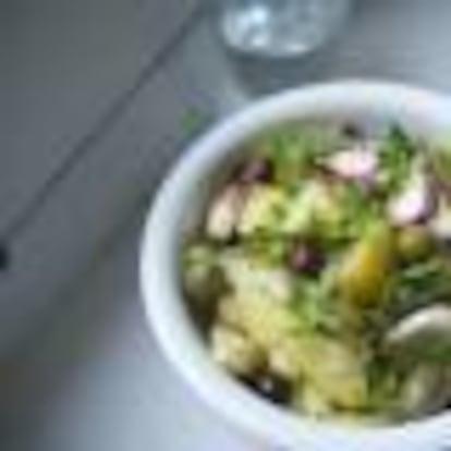Esta ensalada es sorprendentemente fresca y ligera, alegre al paladar y a pesar de ser bastante patatera no empapuza lo más mínimo.