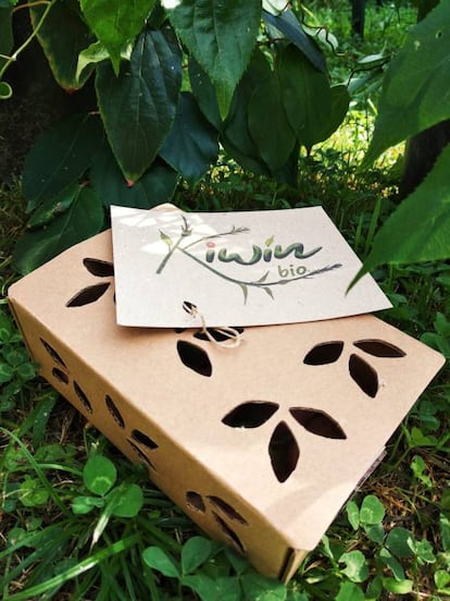Cristina ha plantado sus kiwis en una formación que se denomina T-bar, unas estructuras de madera que sirven de arquitectura a la planta para alzarse y enredarse. Tiene siete variedades, aunque en la rama todas parecen aceitunas. Recolecta fruto a fruto, cuando su punto de maduración es el justo, sin transición frigorífica. Directos cada uno a las cajitas de 150 gramos que vende por 2,80 euros. Según el día que le pidas por Instagram, Facebook o por teléfono, te tocan de unos colores u otros, aunque siempre intente servir una mezcla completa. Tiene más demanda de la que puede atender, así que probablemente hayas de esperar unos días, porque no piensa plantar más de lo que pueda atender ella sola. Pero la espera merecerá la pena, porque te los ventilarás en un pispás, con la alegría acelerada de un border collie loco.