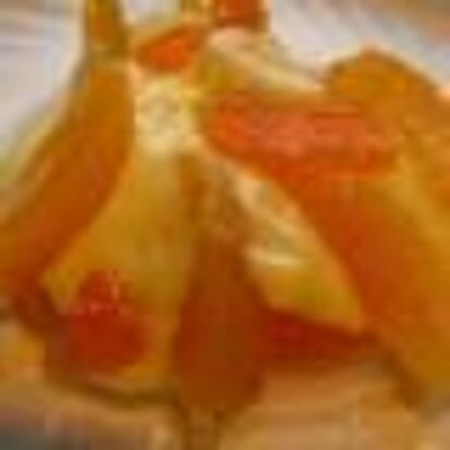Un tartar de pescado con frutas de temporada, facilísimo de convertir en ensalada añadiéndole un lecho de hojas verdes –por ejemplo, rúcula o escarola– y una vinagreta sencilla a base de de aceite y limón.