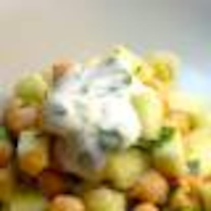 Ensalada de garbanzos y pepino con salsa de yogur, menta y eneldo