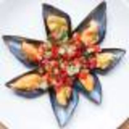 Mejillones con vinagreta de pimiento, tomate y pepino