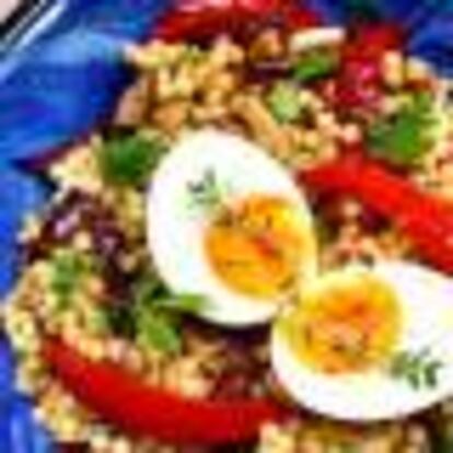 Salteado mediterráneo de hortalizas con pasta y huevo