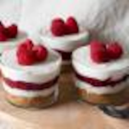 Estos vasitos inspirados en un cheesecake combinan todo el sabor y la cremosidad de la crema de queso con el sabor agridulce de las frambuesas. Un jetapostre rápido, fácil y sin horno.