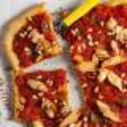 La masa de esta coca destapada valenciana va sin fermentar, por lo que se prepara en menos tiempo que otras. Junto al tomate rematan la jugada los pimientos, unos piñoñes y la ‘tonyina de sorra’ (ventresca de atún salada).