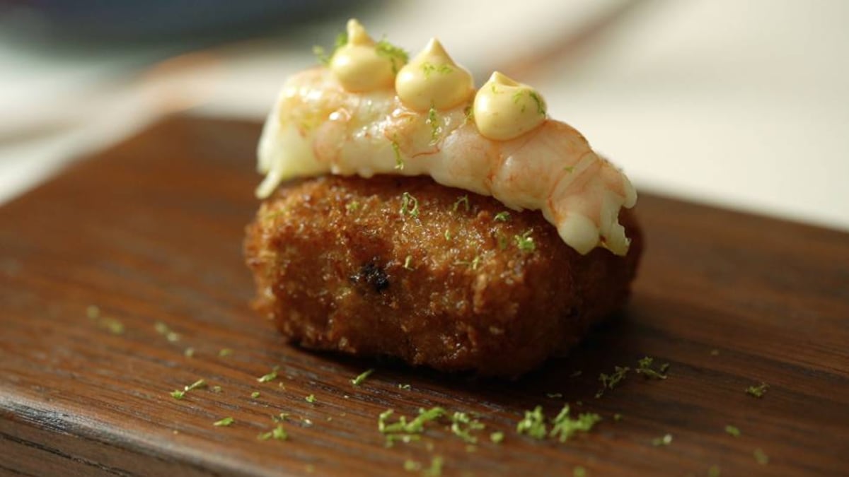 - Pasar un momento por el grill las colas de cigalas, lo justo para que queden semicrudas. Servir las croquetas con las cigalas encima, unos puntos de mayonesa de gambas y un toque de lima rallada al momento.