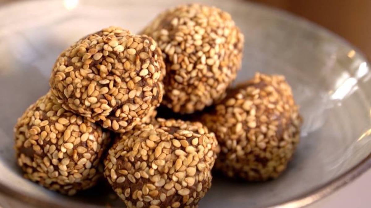 - Volver a enfriar las bolitas y cuando estén duras rebozarlas con una mezcla de cacao natural y semillas de sésamo tostadas.