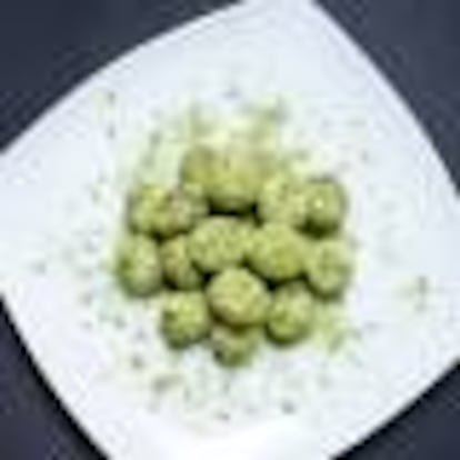 Las catánias son unos bombones preparados con praliné de chocolate que envuelve una almendra garrapiñada y, para rematar, se espolvorea con cacao amargo o, en este caso, con té matcha.