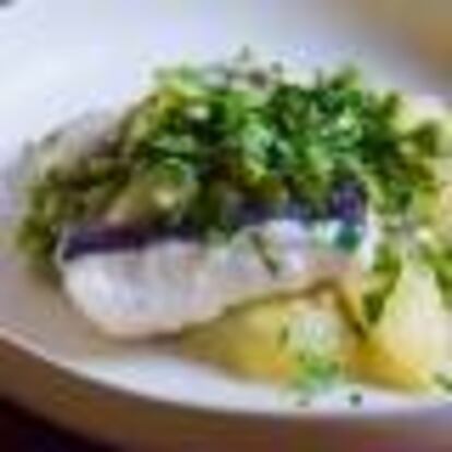 CABALLA CON PATATAS, CEBOLLA Y GREMOLATA DE ALMENDRA