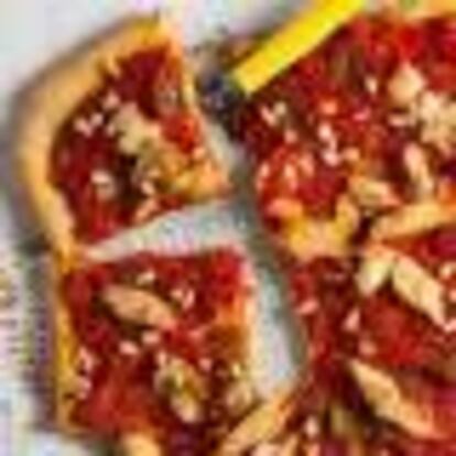 La masa de esta coca destapada valenciana va sin fermentar, por lo que se prepara en menos tiempo que otras. Junto al tomate rematan la jugada los pimientos, unos piñoñes y la ‘tonyina de sorra’ (ventresca de atún salada).