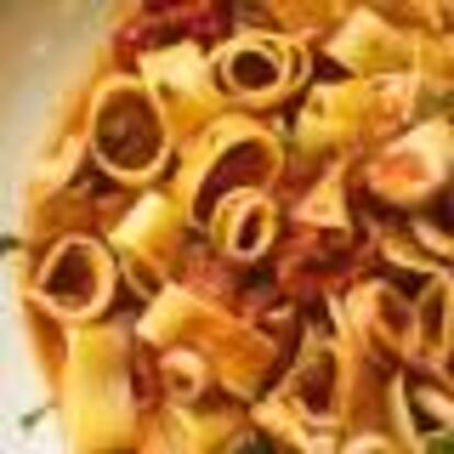 Calamar y calamarata son los dos principales ingredientes de este plato: el primero es el molusco, y el segundo, una pasta con su forma. El tomate, el ajo y el perejil también están invitados a la fiesta.