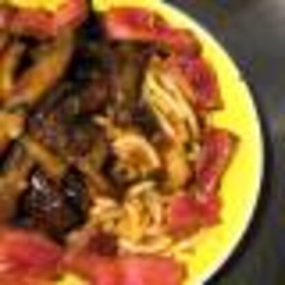 La berenjena cocida al vapor y guisada después con salsa de soja, vinagre de arroz y otros condimentos, sumados a la ternera marinada y salteada, forman un acompañamiento fastuoso para esta clase de pasta.