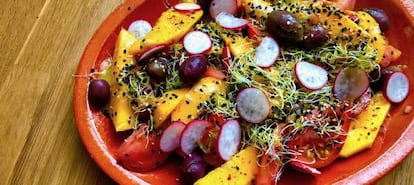 El verano es tiempo de ensaladas -porque no te entra mucho más- y ya no sabes de qué prepararlas: prueba a poner mango en la clásica ensalada de tomate y remata con unos germinados y el toque crujiente del rabanito.